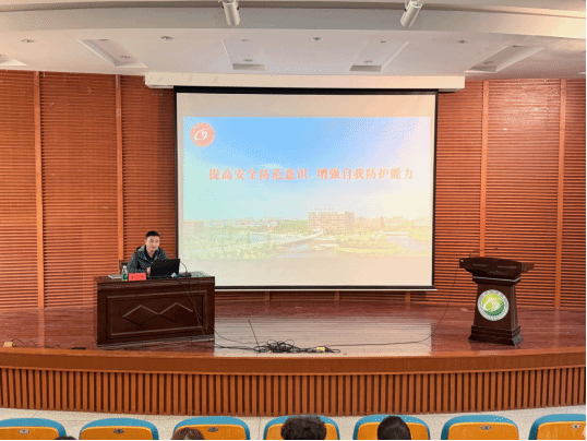 李义峰作《提高安全防范意识 增强自我防护能力》专题讲座,他围绕消防安全、交通安全、防范电信网络诈骗等内容展开详细讲解,通过播放火灾事故视频、展示消防隐患图片等提醒排查消防隐患;用事故数据强调交通规则,呼吁同学们维护交通秩序;结合“冒充客服退款”等案例,拆解诈骗套路,传授“三不一要”防骗口诀,提醒同学们增强反诈意识。