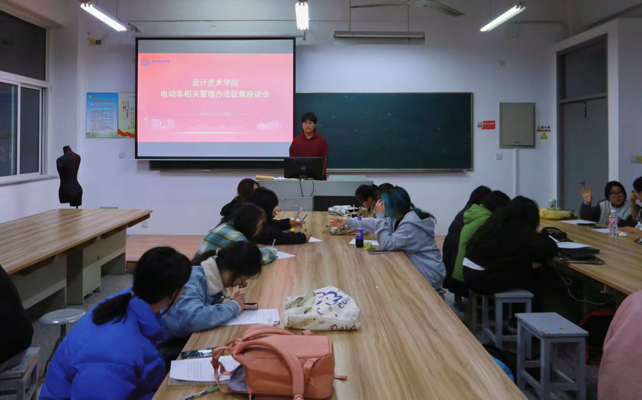 为进一步加强和规范校内电动自行车安全管理,营造安全、稳定、和谐的校园环境,11月10日晚,设计艺术学院在润美楼B209召开电动车相关管理办法征集学生座谈会,30余名学生代表参加。