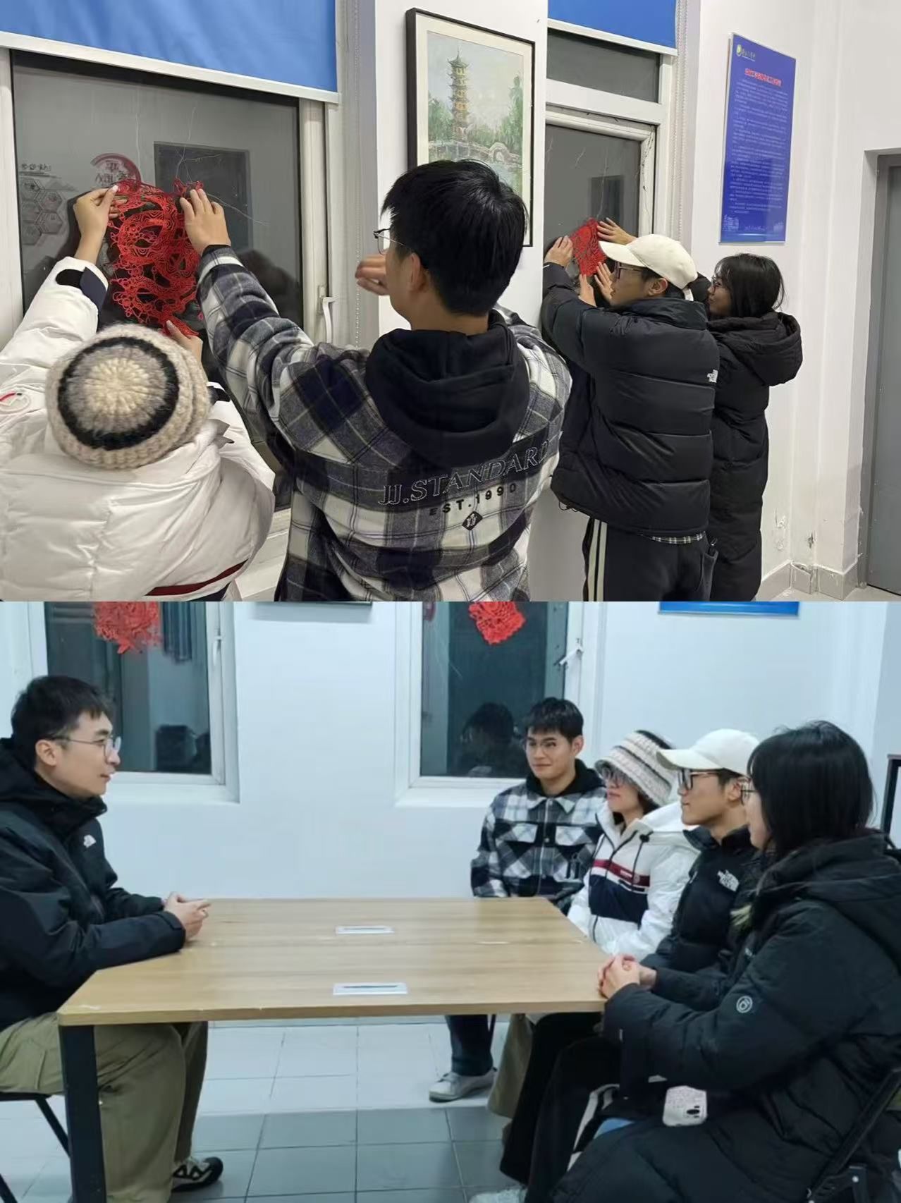 本次活动征集了学生创作的众多春联、剪纸等传统手工艺作品,评选后将优秀作品布置于“一站式”学生社区。在师生们共同布置下,社区氛围喜庆而温馨,辅导员王硕也为忙碌的同学送上新年的祝福,传递新年的美好愿望。新年贺卡的制作环节中,同学们用心书写祝福并送予各位老师,感谢老师们的辛勤付出。