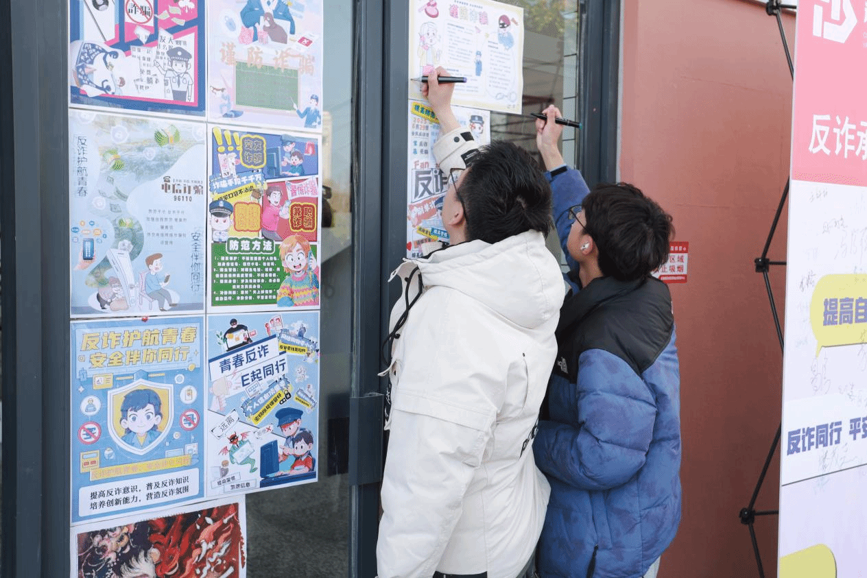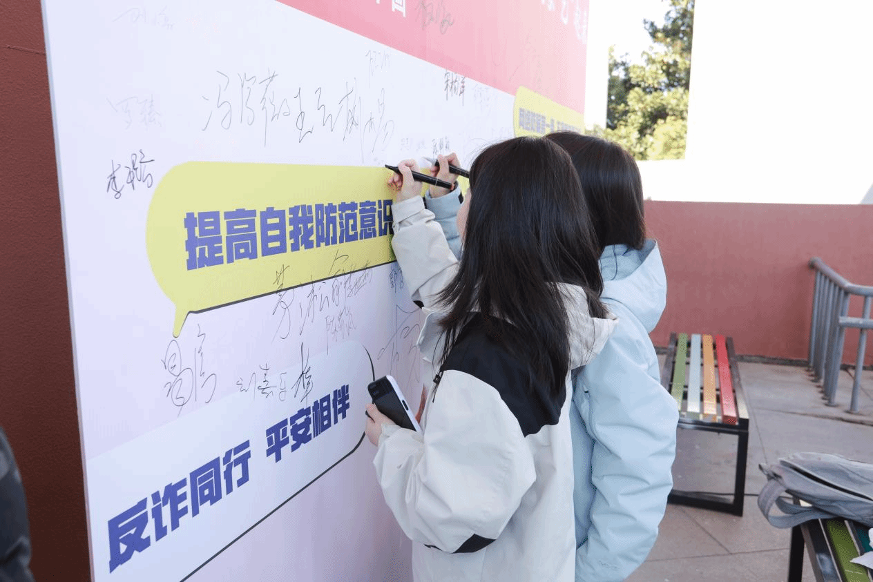 志愿者们还通过情景模拟问答、案例解析宣传册发放等形式向同学们普及常见的诈骗手段和实用的防骗技巧。在充分了解反诈知识后,同学们纷纷来到签名墙前,郑重签下自己的名字,并为自己喜欢的反诈海报投票,表达积极参与反诈行动、守护财产安全的坚定决心。