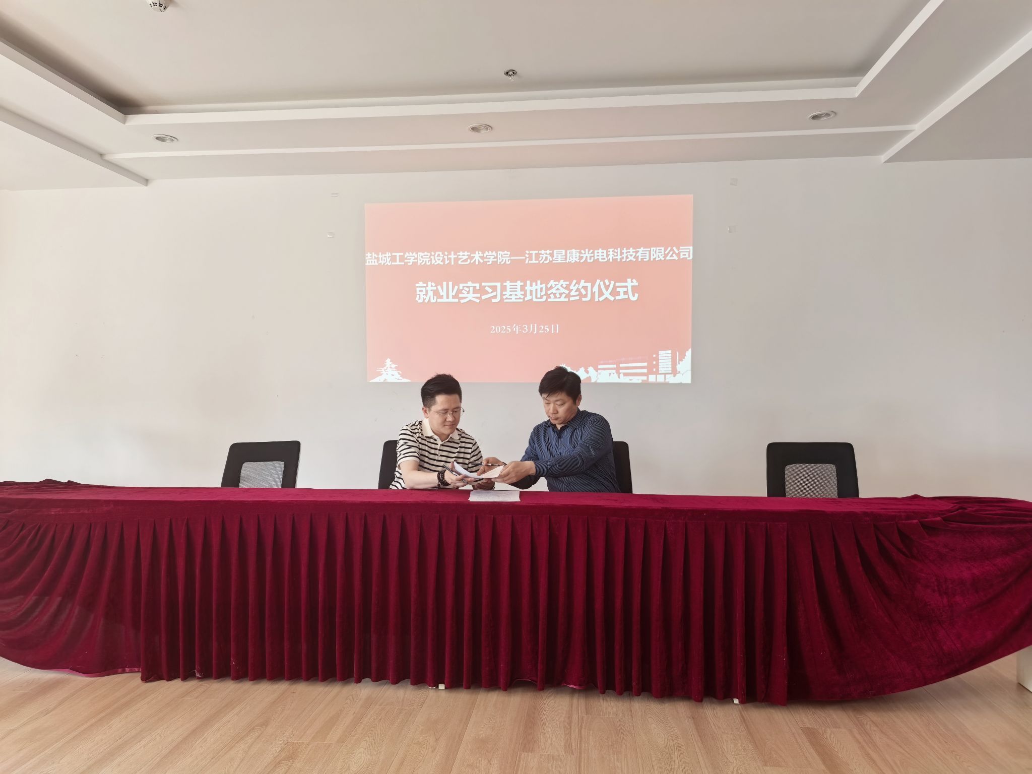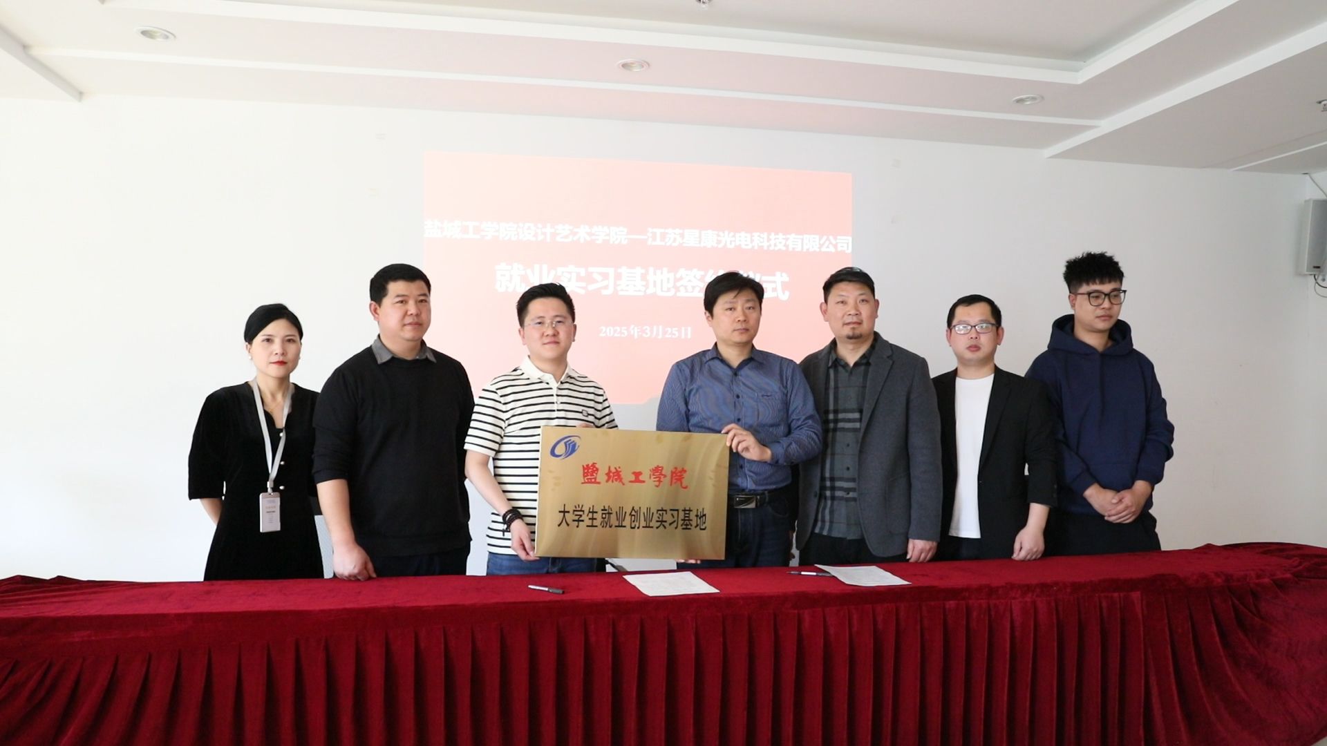 江苏星康光电科技有限公司董事长景伟热情接待张庆领一行。他详细介绍了企业远景目标、业务领域、员工成长发展等情况,并表示,愿意为学校提供充足的实习岗位和就业机会,帮助学生提升动手实践能力和岗位适应能力。张庆领在认真听取了企业对人才培养的建议和具体招聘需求后表示,将以此次调研为契机,持续深化校企合作,创新人才培养模式,为企业发展提供人才支撑。同时,他希望企业能够继续支持学院发展,共同为培养高素质技术技能人才、服务产业转型升级贡献力量。双方还就人才培养、学科建设、校企合作等方面的细节问题进行了深入交流,并签订就业实习基地共建协议,举行“盐城工学院大学生就业创业实习基地”挂牌仪式。