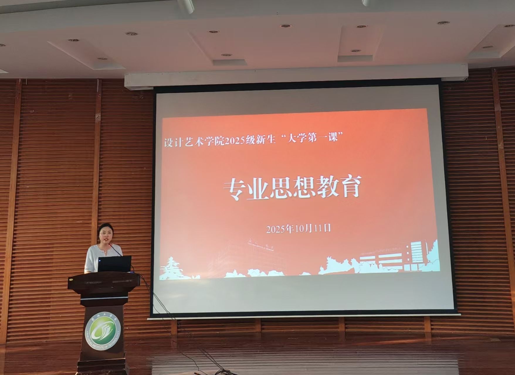 10 月 11 日下午,设计艺术学院在南校区润美楼报告厅举办2025级本科新生“大学第一课”专业教育活动。学院院长张军、党总支书记刘荣、学术助理朱金华、产品设计专业系主任钱峰、环境设计专业系主任徐丹、服装与服饰设计专业系主任周科、视觉传达设计专业系主任吉静、创意与设计实验中心主任戚凤国、设计基础部副主任卢思宇、新生辅导员韩晓晓及全体2025级新生参加。会议由学院学工办主任顾清主持。
