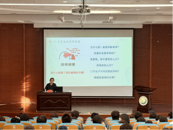 徐新华以《探究爱情密码》为题开展恋爱交友与婚育文化教育讲座。围绕“爱是艺术”“恋爱相处之道”“双向奔赴成长”等核心内容,结合思想政治教育与生活实际,引导新生正确认识情感关系,学会经营健康人际交往,树立负责任的婚恋观。讲座中,她还寄语新生以宽广心胸、谦虚态度、深沉思考面对大学时光,在成长中兼顾学业与心智成熟。