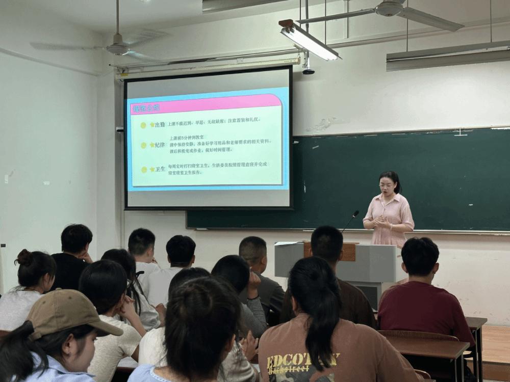 戴心怡结合《学生手册》就学校的规章制度、校园文化、安全教育等方面进行了详细的讲解,重点强调了宿舍消防安全、出行安全、网络安全及防诈骗知识,提醒同学们养成良好的生活习惯,提高自我保护能力。