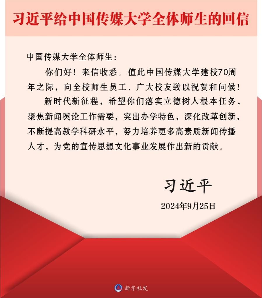 新华社北京9月26日电 近日,中共中央总书记、国家主席、中央军委主席习近平给中国传媒大学全体师生回信,在中国传媒大学建校70周年之际,向全校师生员工、广大校友致以祝贺和问候。