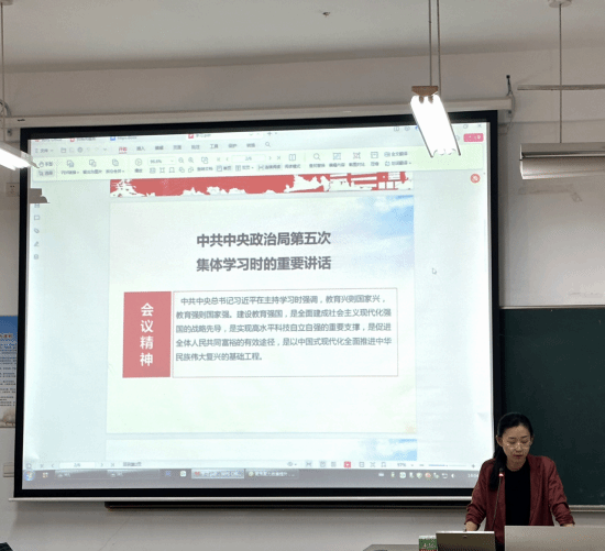 袁媛重点领学了习近平总书记在《求是》杂志发表的题为《努力成长为对党和人民忠诚可靠、堪当时代重任的栋梁之才》一文的主要内容,并结合学习内容,联系我院即将开展的审核性评估工作,从师德师风、教学能力、教学投入、教师发展四个方面,系统阐述我院如何打造一支信念坚、政治强、本领高、作风硬的教师队伍。