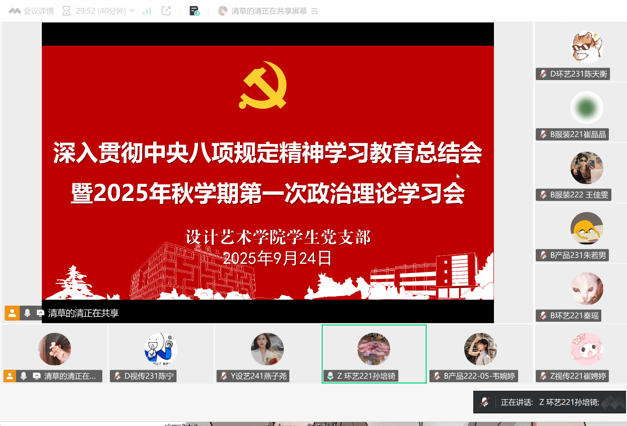 9月24日,我院学生党支部通过腾讯会议在线召开深入贯彻中央八项规定精神学习教育总结会暨2025年秋学期第一次政治理论学习会。全体学生党员参会。会议由党支部书记顾清主持。