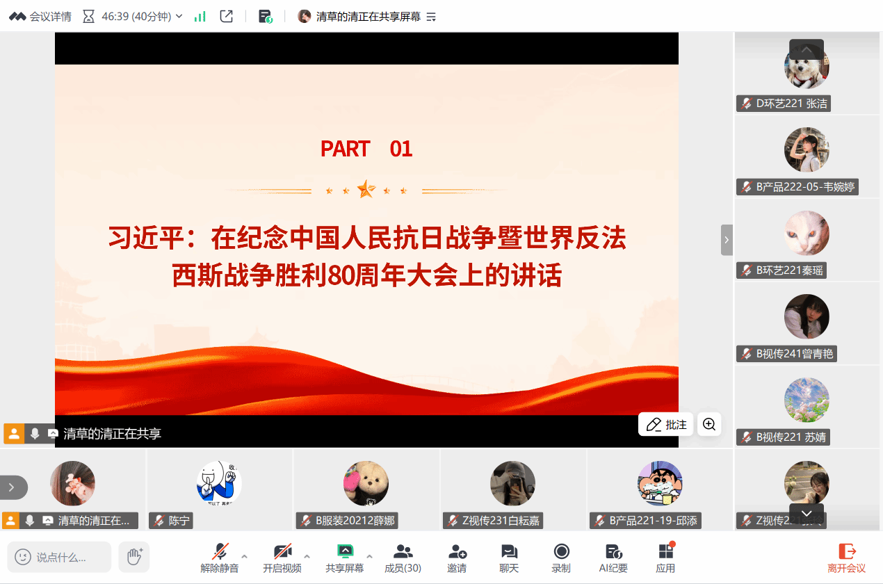 随后,她带领全体党员深入学习习近平总书记在纪念中国人民抗日战争暨世界反法西斯战争胜利80周年大会和招待会上的重要讲话以及《求是》杂志上刊登的习近平总书记重要文章《弘扬伟大抗战精神,向着中华民族伟大复兴的光辉彼岸奋勇前进》。党员们从中深刻领会到抗战胜利的重大意义与伟大抗战精神内涵,进一步明确了新时代青年在民族复兴征程中的责任与使命。