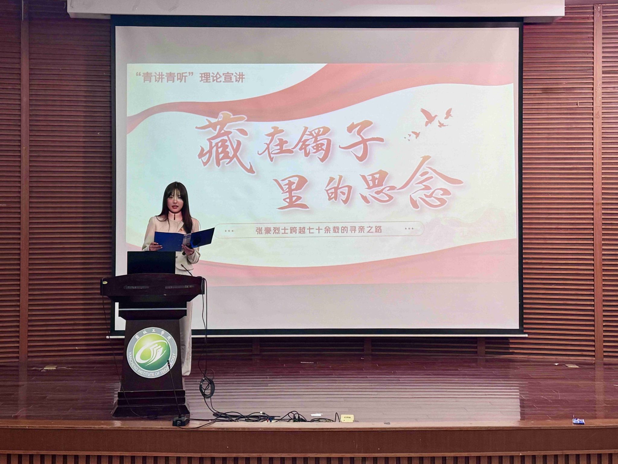 宣讲团成员围绕“寻亲慰英烈,红色永传承”主题,依次讲述了《一张特殊的“护身符”》《日军刺刀下的“盐阜红嫂”》《6代人76年的守望:辛立珍烈士魂归故乡》《一张抗战残照:跨越73年的红色传奇》《恩重如山:张庄老乡的生死守护》《传承红色基因:何川兰烈士的十年寻亲路》《藏在银镯里的思念》等七个感人至深的红色寻亲故事。从战火纷飞中烈士与亲人的隔空牵挂,到和平年代里后人跨越山海的寻亲坚守,一个个鲜活的人物、一段段揪心的过往、一次次执着的坚守,让尘封的红色历史变得可感可触、直抵人心,现场不时响起阵阵掌声。宣讲中,徐振理七上央视《等着我》的执着,请现场学子感受到英烈精神背后跨越时空的家国情怀。宣讲尾声,宣讲团成员结合新时代青年使命,将铁军精神与青年担当深度融合,引导同学们从红色故事中汲取奋进力量,把英烈精神转化为勤学笃行、练就本领的实际行动。
