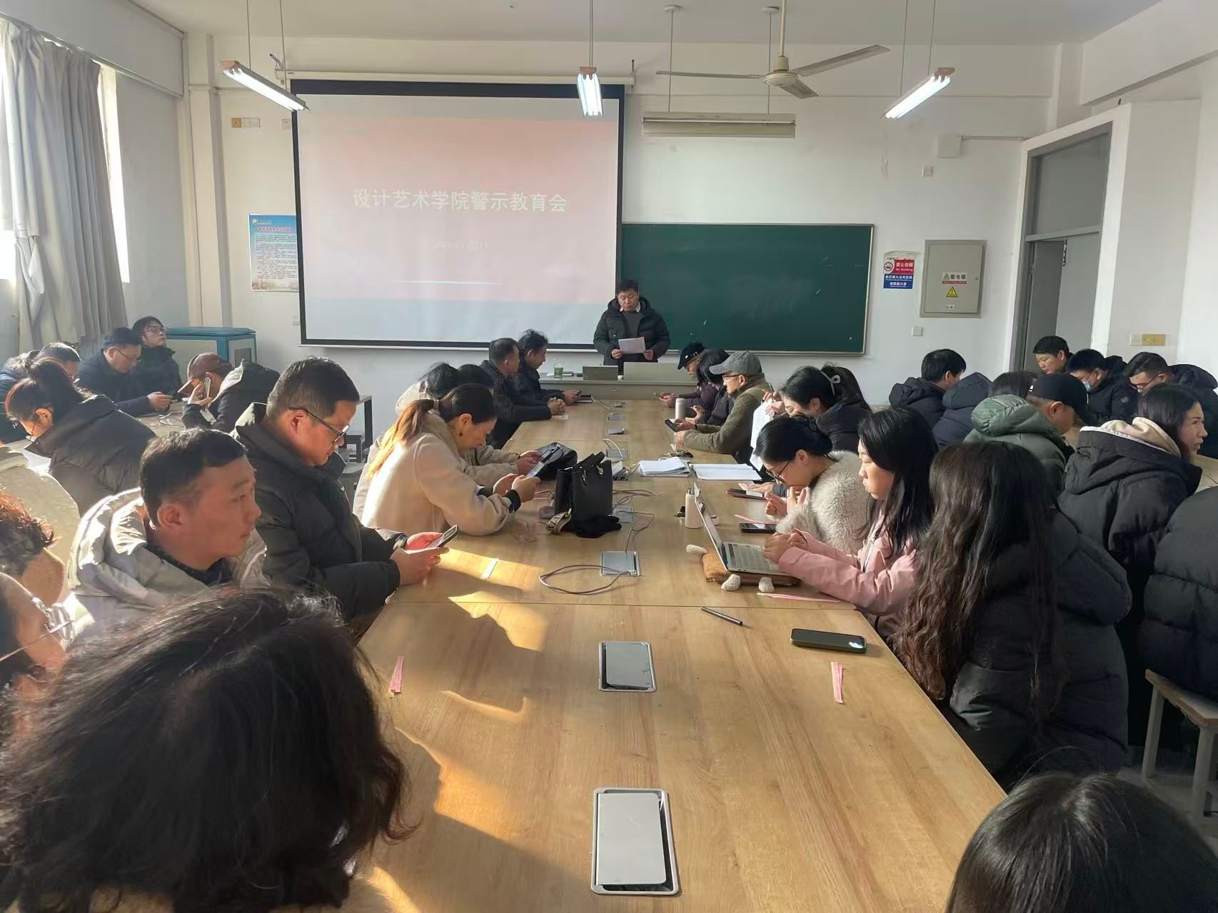 1月7日下午,设计艺术学院在润美楼A209教师召开节假日“纠四风”树新风警示教育会,学院全体教职工参加。党总支副书记、纪检委员张庆领传达了校纪委《关于做好2026年元旦春节期间纠“四风”树新风工作的通知》,通报了违反中央八项规定精神典型问题,强调学院广大党员干部和教师要以案为鉴,把中央八项规定作为基本的、必备的规矩,自觉反“四风”树新风,确保节日期间风清气正,营造良好的节日氛围。