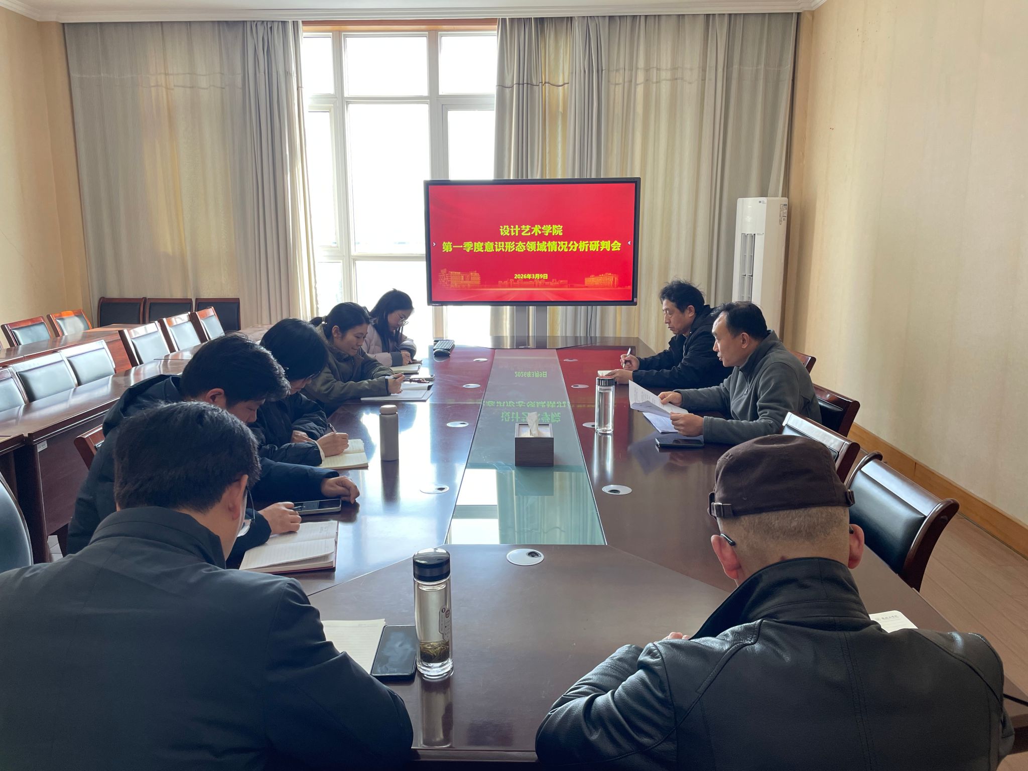 3月9日下午,在润美楼A311东会议室,设计艺术学院召开2026年第一季度意识形态领域情况分析研判会。院党总支书记刘荣主持会议并讲话,全体院领导、科级干部等参加。