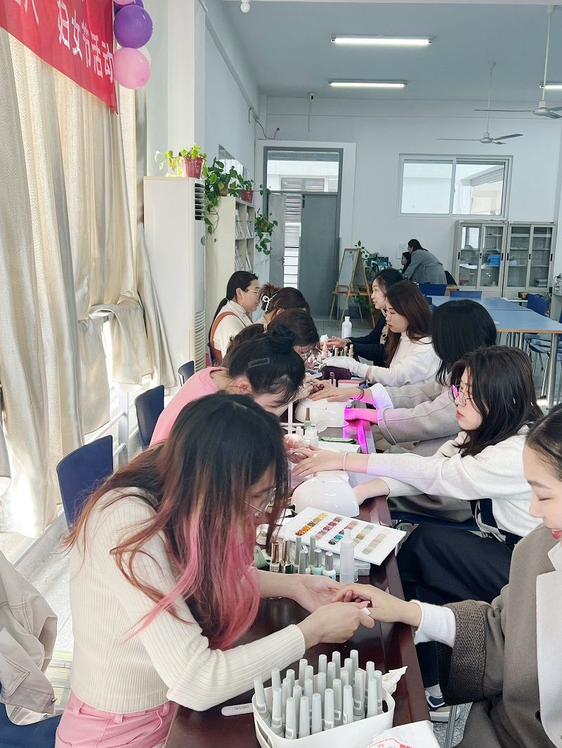 学院5名优秀学生共同组成了美甲志愿服务团队,同学们通过劳动教育的行动实践感恩学院女教师的悉心教导和辛勤付出。为做好本次活动,团队精心布置了活动场所,工作台上各色甲油胶、靓丽的甲片、美甲灯等一应俱全,现场还准备了免洗手消毒液、湿巾等物品。修剪、打磨、抛光、打底、上色……团队凭借熟练的技法与优质的服务,用真心、耐心和爱心为到场女教师提供了专业的美甲服务,得到了女老师们的一致褒扬。