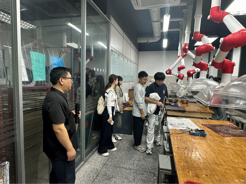 戚凤国带领新生们参观了学院的科研实验室集群,并详细介绍了数字媒体实验室、材料工艺实验室及陶艺工作实验室等科研平台的技术配置与研究定位。在参观过程中,着重讲解了各实验室在支撑设计创新研究中的功能定位,以及跨学科研究方法在设计实践中的应用前景。这种沉浸式的平台体验,使新生对设计研究的硬件支撑与跨学科研究方法有了更为直观的认识。
