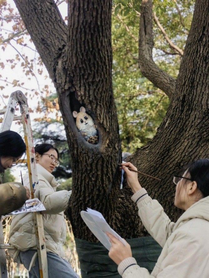 学院师生严格遵循市园林绿化管理处制定的树洞修复科学流程,深入了解树洞密封和伤口愈合剂的使用情况,并结合树木的实际状况进行从点到面的设计美化及片区更新。在此基础上,同学们用环保颜料在修复后的树木上绘制出一只只栩栩如生的小动物和一幅幅引人入胜的湿地画面,成为公园中一道独特的风景线。这一活动不时的吸引了游园市民驻足欣赏,并赢得了他们的称赞。树木修复的成果也得到了各方的一致好评。