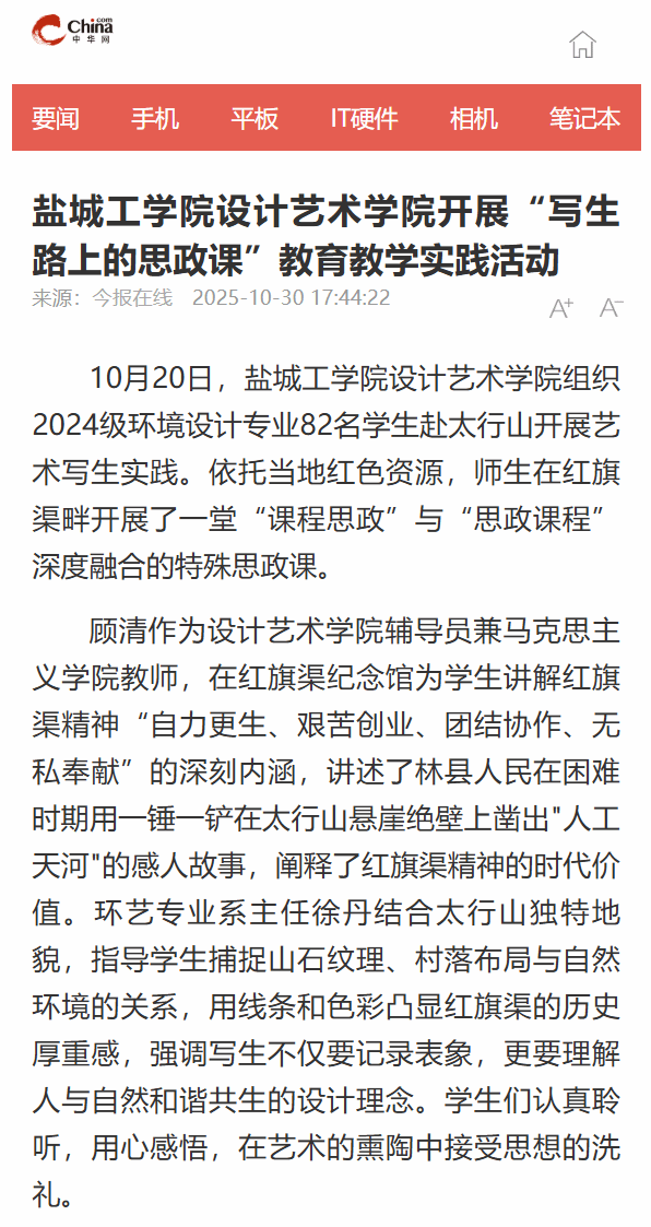 10月20日,盐城工学院设计艺术学院组织2024级环境设计专业82名学生赴太行山开展艺术写生实践。依托当地红色资源,师生在红旗渠畔开展了一堂“课程思政”与“思政课程”深度融合的特殊思政课。