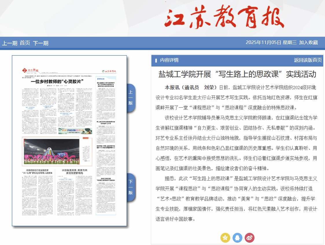 据悉,此次“写生路上的思政课”是盐城工学院设计艺术学院与马克思主义学院开展“课程思政”与“思政课程”协同育人的生动实践。该校将持续打造“艺术+思政”教育教学品牌活动,推动“美育”与“思政”深度融合,提升学生专业技能,厚植家国情怀,强化责任担当,将红色元素融入艺术创作,用设计语言讲好中国故事。