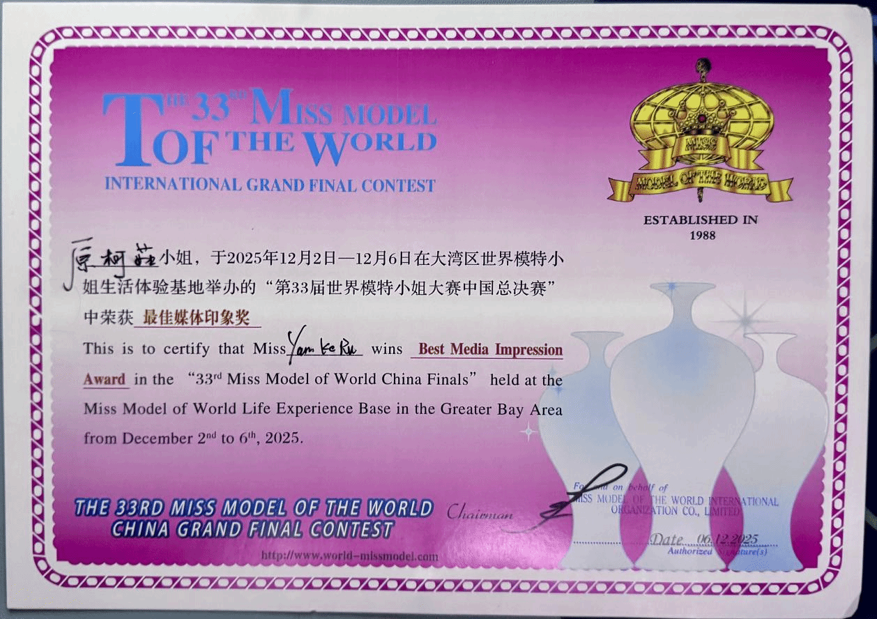 近日,第33届世界模特小姐大赛中国总决赛在深圳圆满落幕。我院艾尚模特社成员、B产品241班原柯茹同学凭借过硬的专业素养与出色的现场表现成功入围总决赛,最终斩获“最佳媒体印象奖”,为学院赢得荣誉。